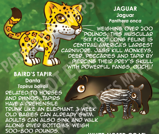 An educational and humorous cartoon-style field guide to the most interesting animals, birds, mammals, fish, amphibians, and insects found in Costa Rica. Folded and laminated, measures 8-1/2 in. x 24 in. open and 8-1/2 in. x 3-1/2 in. folded.